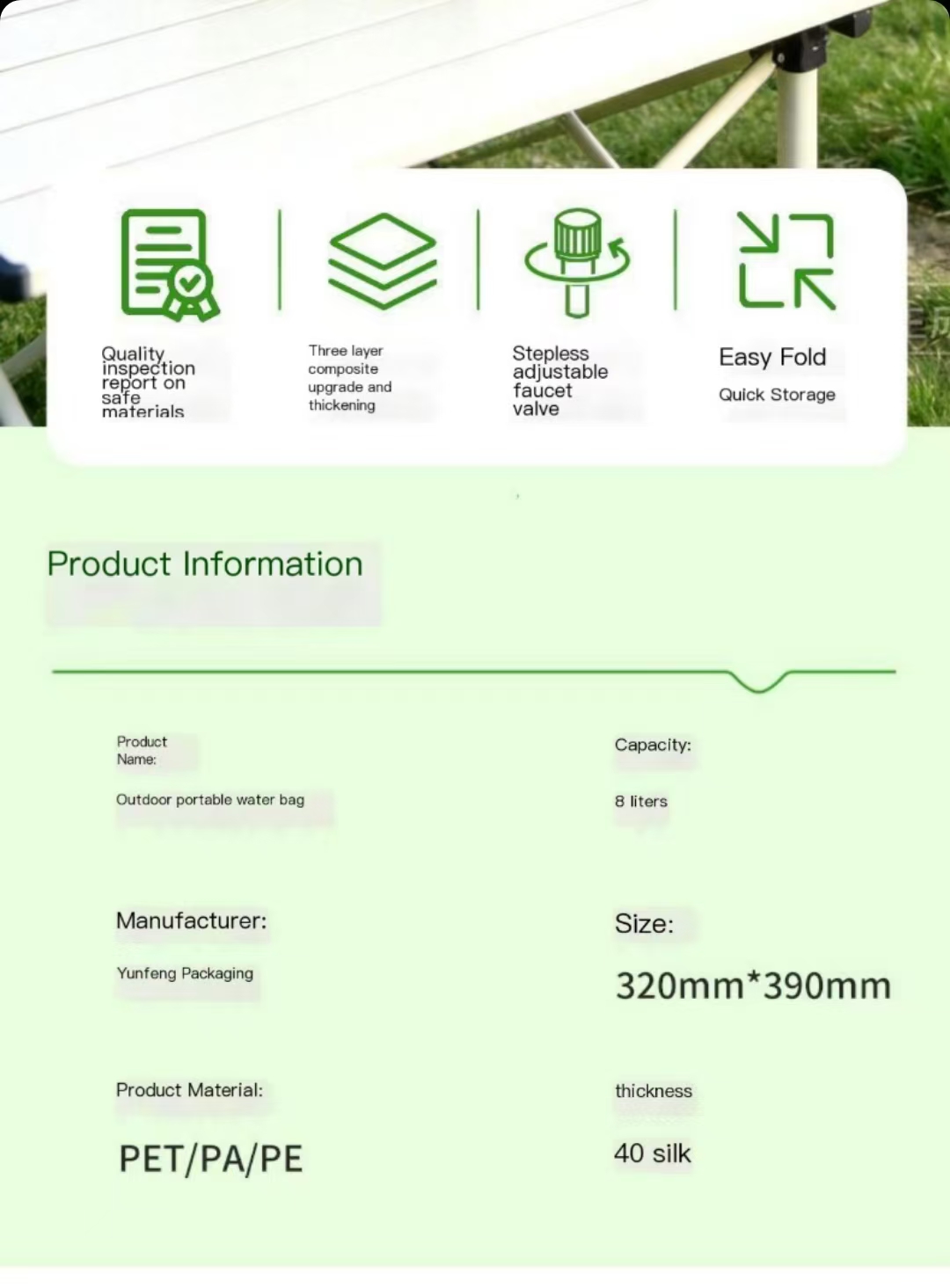 Product Name: Outdoor Portable Water Bag Capacity: 8 liters Dimensions: 320mm*390mm Thickness: 40 microns Material: PET/PA/PE Note: Minimum order of 100 pieces