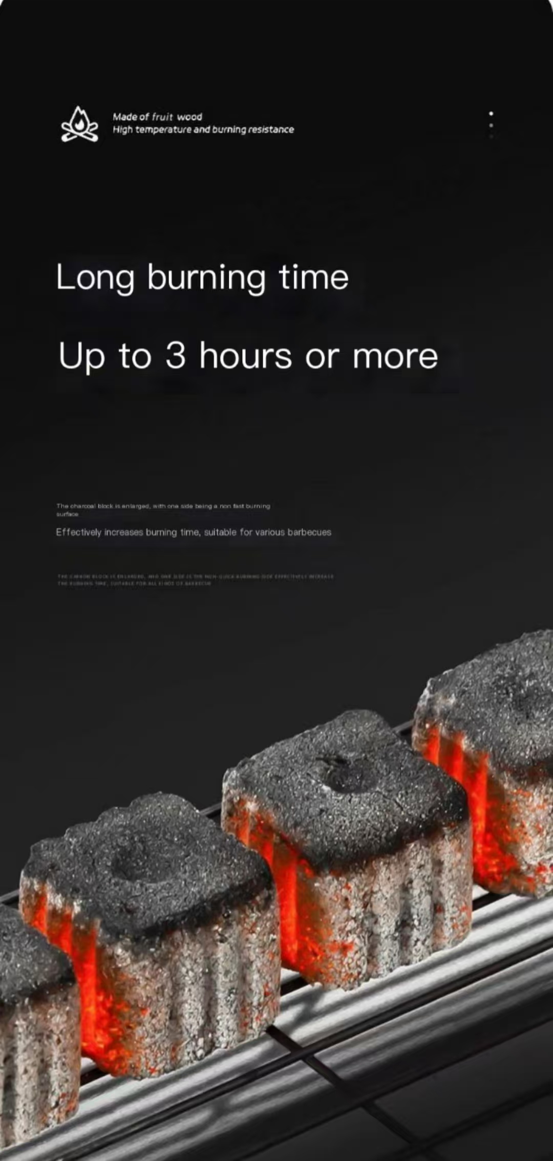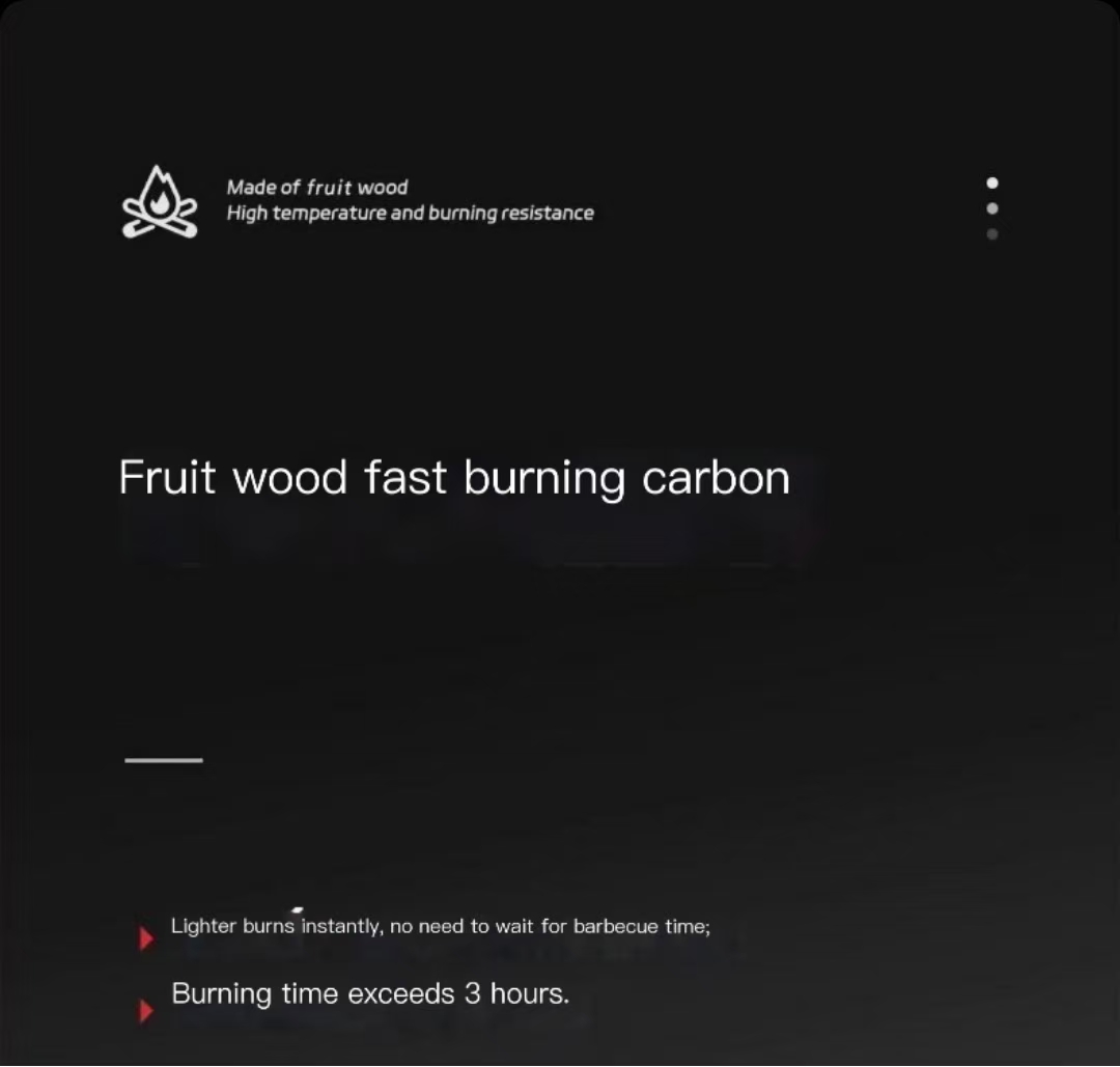 • Quick-burning fruitwood charcoal for barbecue, smokeless, easy to ignite, does not flare up with dripping oil, suitable for indoor and outdoor grilling