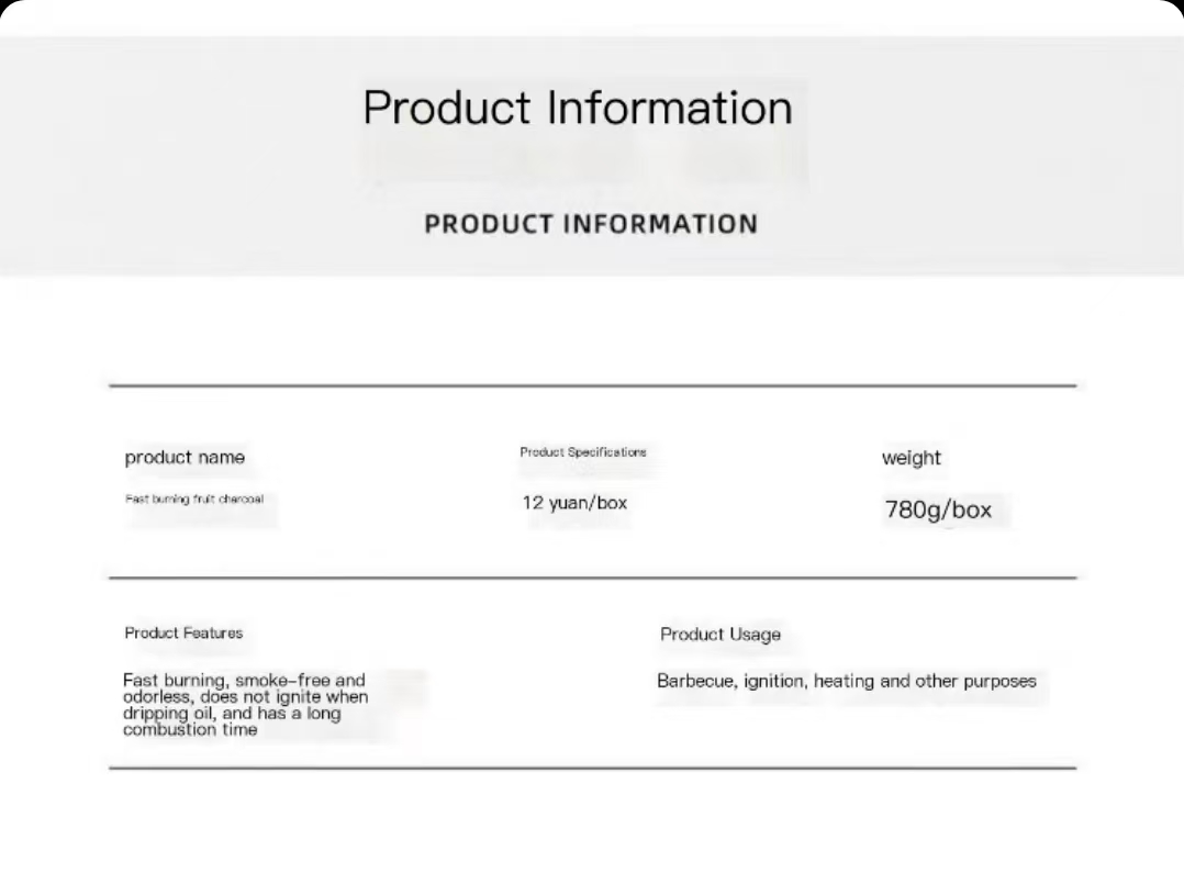Types of BBQ Charcoal: Quick-light Charcoal Applicable Occasions: Home use, Commercial use, Camping Features: Smokeless, Odorless, Quick to Ignite, High Calorific Value Burning Time: 3 hours Maximum Temperature: 600 degrees Note: Minimum order of 10 bags. One bag costs 3 yuan (approximately 70g). 2.56 USD / 1 bag